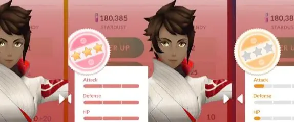 As barras de estatísticas: Abaixo das estrelas, você verá três barras representando Ataque, Defesa e HP. Cada barra representa a pontuação IV, variando de 0 a 15. A barra é dividida em três segmentos, cada um com cinco pontos, e uma barra cheia significa que a estatística tem um IV perfeito de 15.