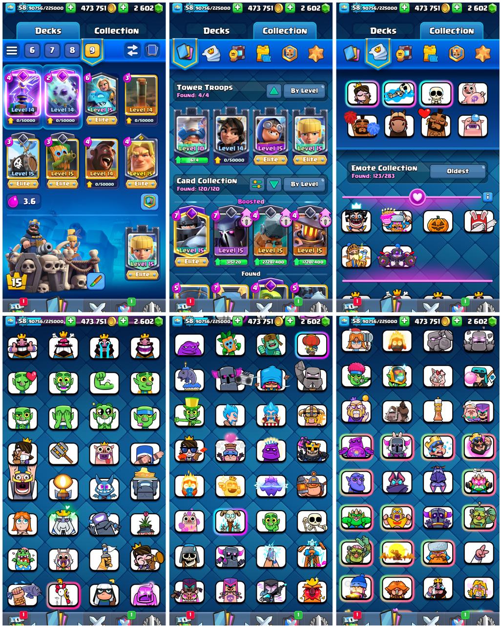 11000 Trophies | Level 58 | King Tower 15 | Arena 24 | Emote 123 Cards 120 | P374