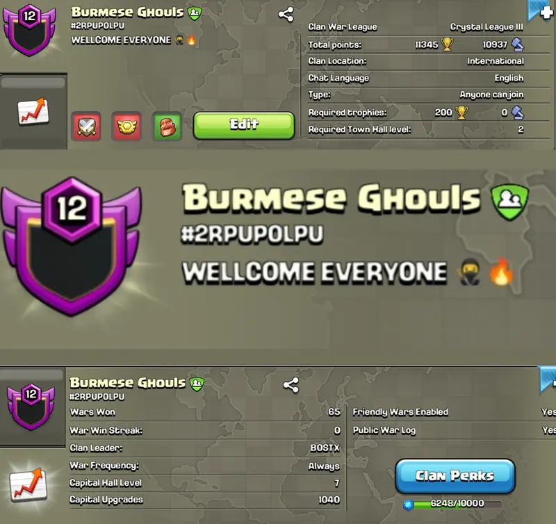 Step into the exciting world of Clash of Clans with the BURMESE GHOULS⚡. Our clan, with a robust level of 12, provides a solid foundation for both newcomers and experienced players alike. The level 7 Clan Castle is a testament to our strategic prowess, offering formidable defense and tactical advantages in every battle. As part of the competitive Crystal 3 League, we ensure a thrilling mix of challenge and growth opportunities. Discover our impressive stats and enjoy the benefits of our special features, designed to offer you a cost-effective and instant gaming experience. Join the BURMESE GHOULS⚡ today and take your gameplay to the next level!
