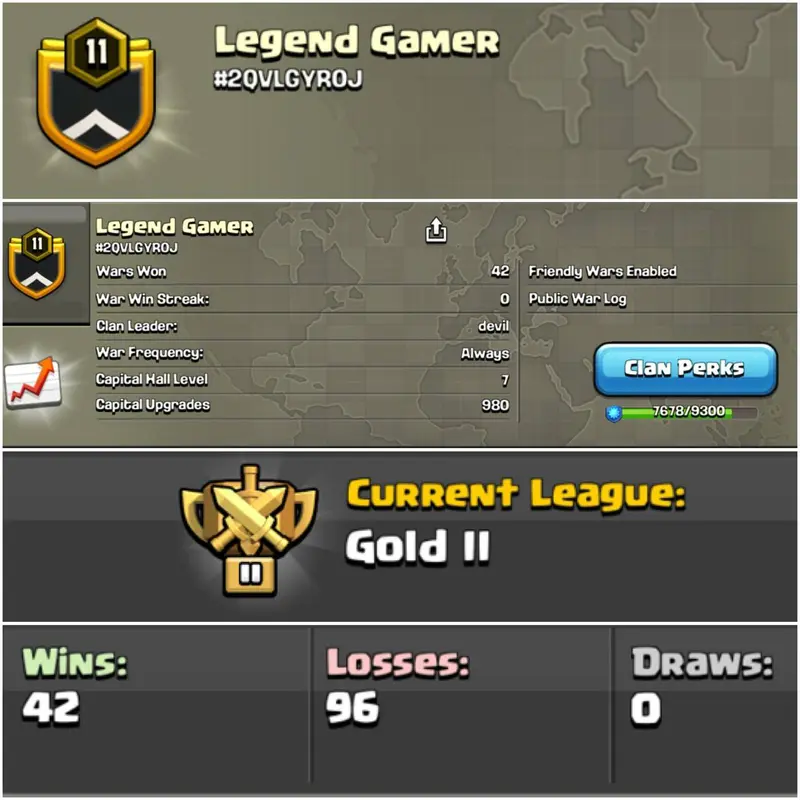 CLAN LEVEL 11 | 💥 LEGEND GAMER 💥 CAPITAL HALL 7 | GOLD II LEAGUE | WARLOG 42-96