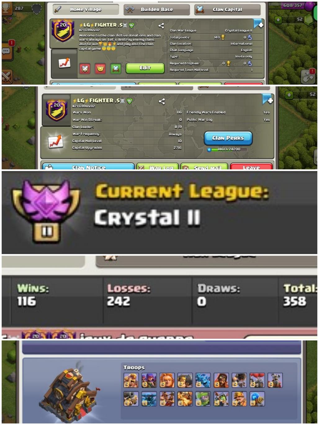 CLAN LEVEL 20 CRYSTAL LEAGUE 2 NAMELG FIGHTERSRARE ENGLISH NAME CLAN CAPITAL 10 WIN 116 LOSS242 LOW PRIC