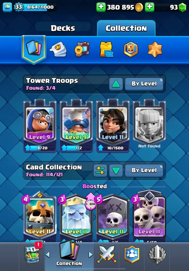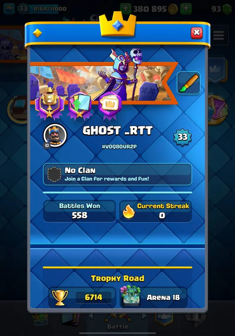 GOOD CARDS 💎 ARENA 18 💎 TROPHY 6714 [] EMOTE 25 [] XP 33 [] FREE RENAME || CARDS 114- AVAILABLE - INSTANT