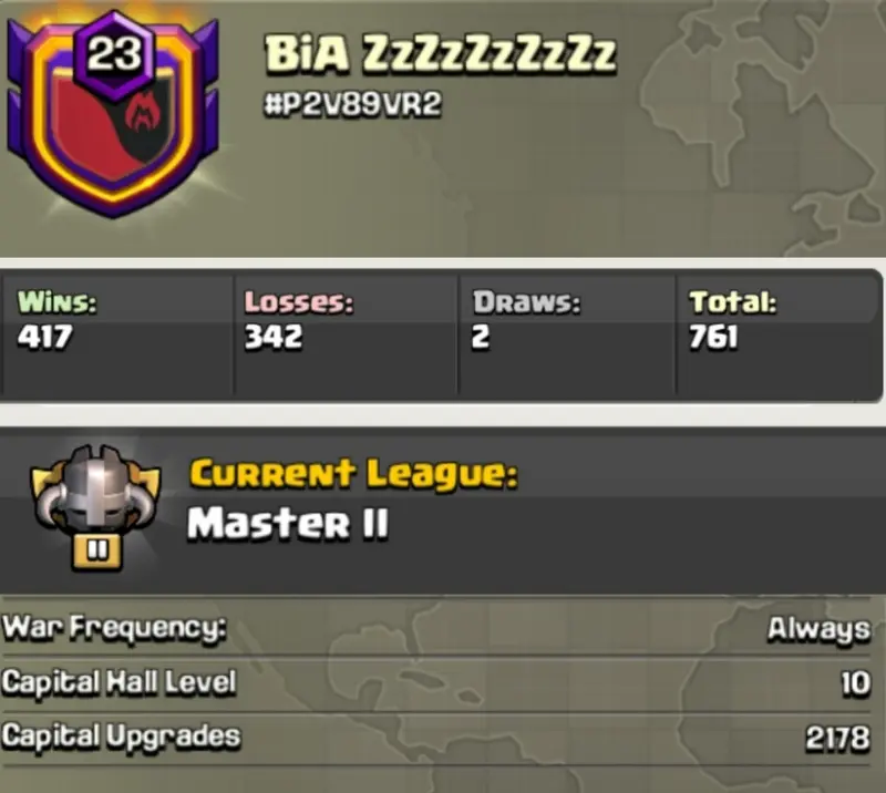 GREAT CLAN 💎 NAME: BiA ZzZzZzZzZz 💎 LEVEL: 23 - CAPITAL HALL: 10 - WAR LOG: 417-342 - CWL League: Master