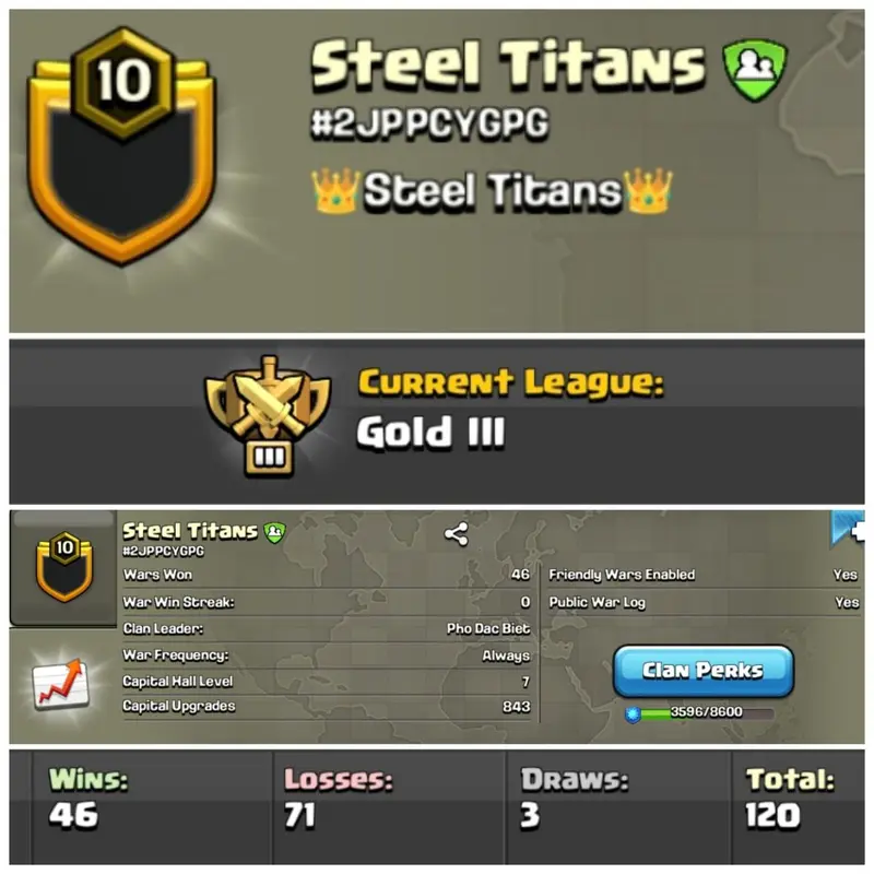 Welcome to Steel Titans, a distinguished Level 10 Clan in the world of Clash of Clans. Proudly standing with a Clan Capital at Level 7, we invite you to join our ranks and experience the strategic brilliance that has earned us the prestigious Gold 3 status. Whether you are a seasoned player or just starting your journey, Steel Titans offers a supportive environment to enhance your skills and enjoy the game to its fullest. Join us and become part of a legacy of excellence!