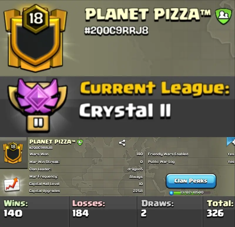 Level 18 clan || clan capital 10 || crystal 2 || name - PLANET PIZZA