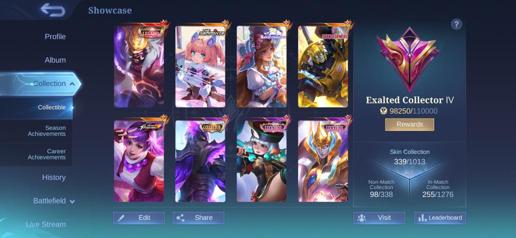 MB859|LV110|HERO 130|SKIN 339|EXALTED COLLECTOR 4|FRANCO LEGEND|KARINA KOF|GUINEVERE KOF|ANGELA THE ASPIRANTS|2 TF|14 EP