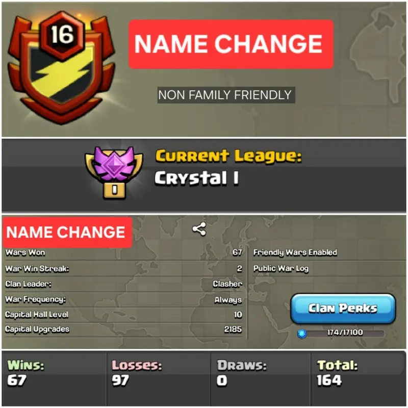 Name change Level 16 clan || crystal 1 || clan capital 10