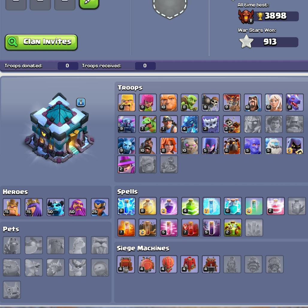 Rare account Giant gauntlet available -208 xp-17 best donation -75-80-50-51-30 heroes-all defence troops near maxed-chea