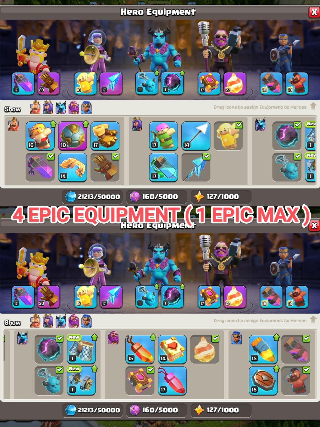 TH17 || SEMI MAX || 7 PETS MAX || HEROES K-95 AQ-95 MP-70 GW-70 RC-45 || 4 EPIC EQUIP ( 1 EPIC MAX ) || 2K RENAME || 1K GEMS