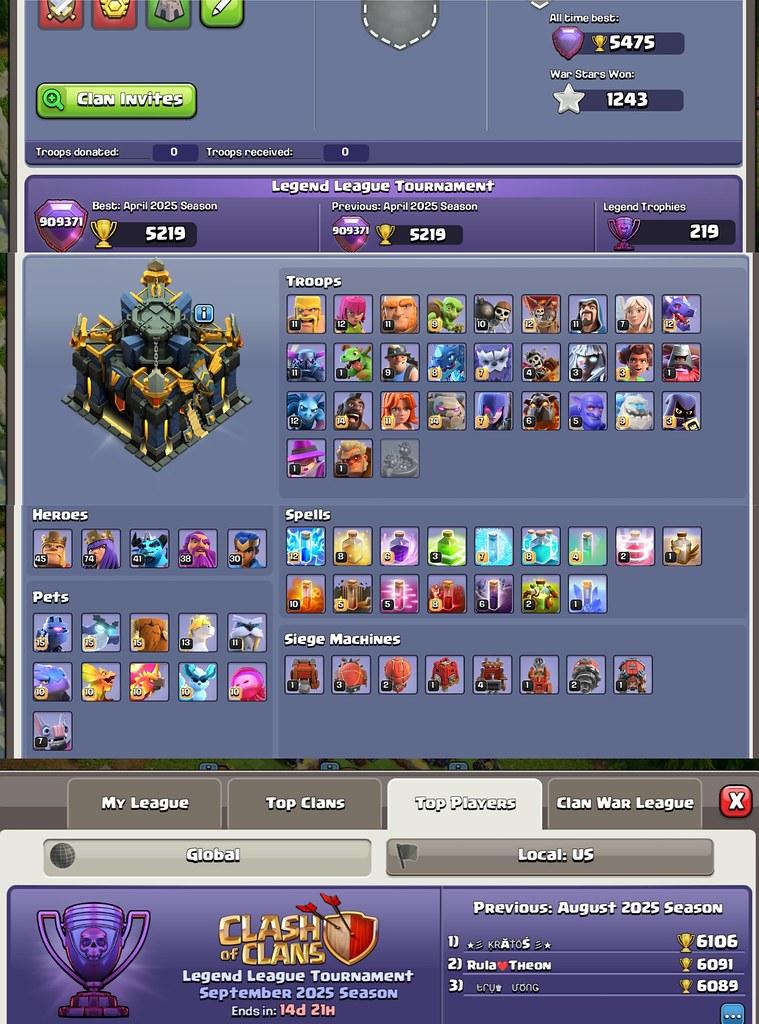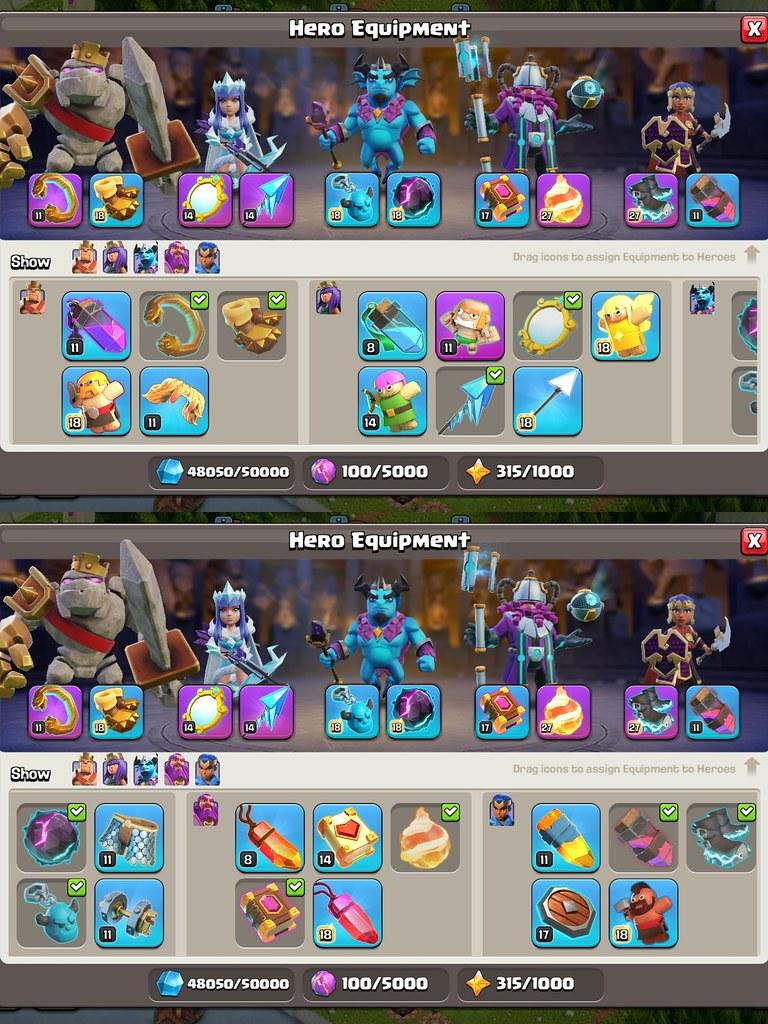 TH17 || USA LOCAL || 8 PETS MAX & 12 TROOPS MAX || HEROES K-45 AQ-74 MP-41 GW-38 RC-30 || 6 EPIC EQUIPMENT ( 2 EPIC MAX )