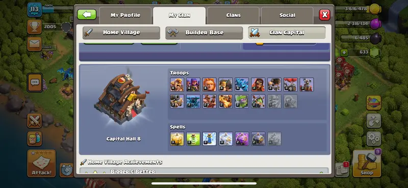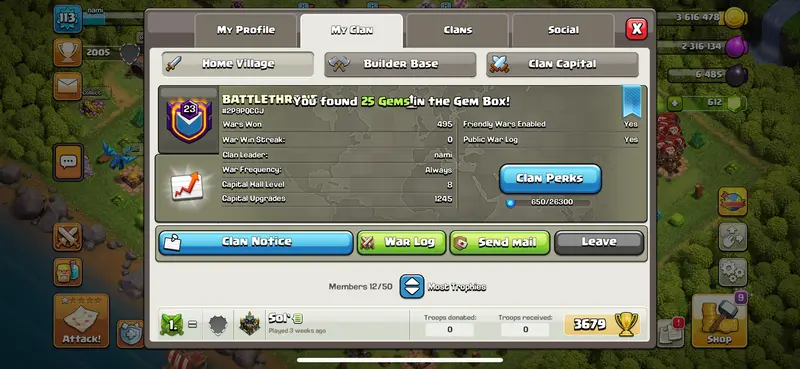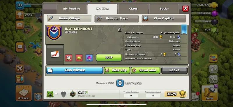 UNIQUE NAME CLAN LVL 23 BATTLETHRONE CRYSTAL LEAGUE LVL 8 CAPITAL