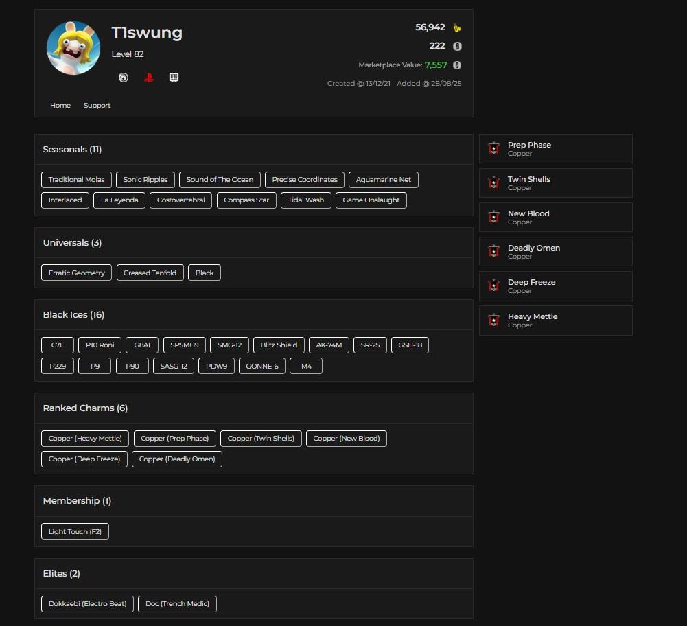 [UPLAY] 82 LVL - 16X BLACK ICES - 3X UNIVERSALS - 11X SEASONALS - 2X ELITES - 63 OPERATORS - 56K RENOWN FA.txt