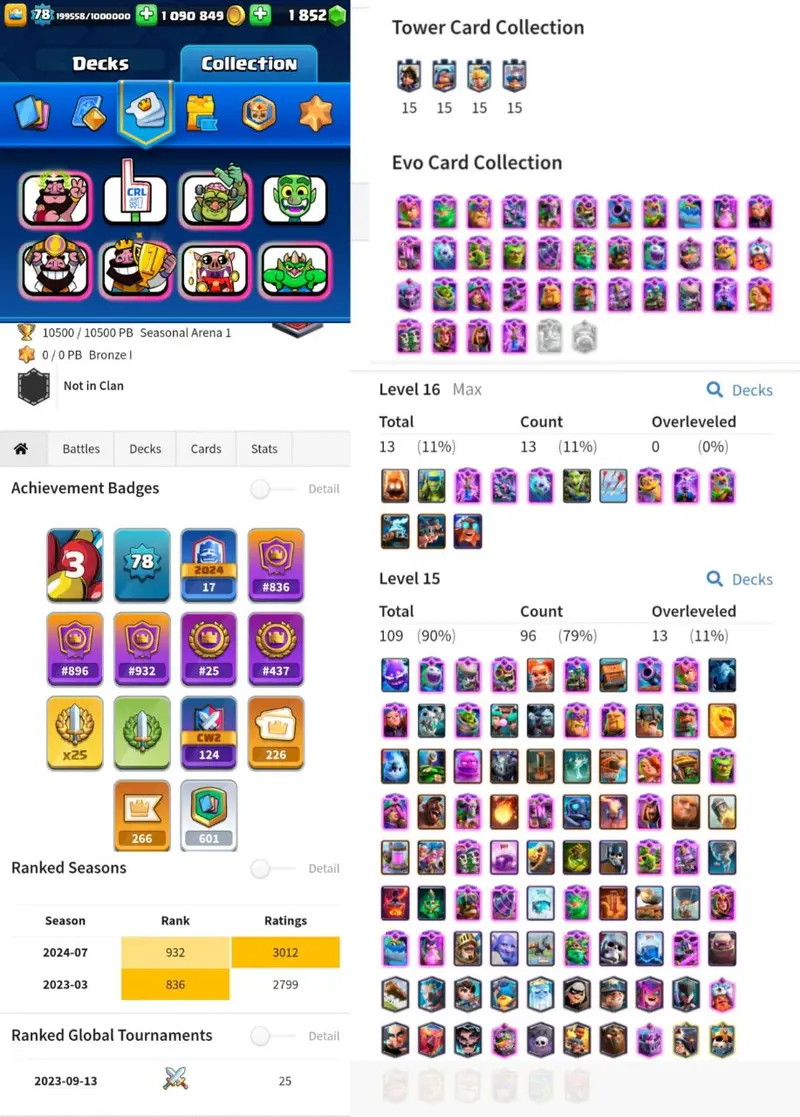 Usa Local | Gt Emote | Lvl 78 | 16 Level Card 13 | Elite 113 | Evo 37 | Global Rank 25 | Crl Old Badge | Tower Skin 30