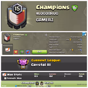 Champions !! LEVEL 15 !! WIN 153 LOSS 102 !! CRYSTAL 3 !! PERFECT NAME !! GOOD WAR LOG !! AFFORDABLE !! INSTANT DELIVERY