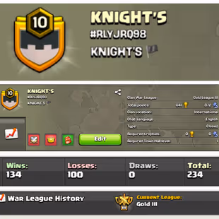 KNIGHT'S !! LEVEL 10 !! WIN 134 LOSS 100 !! POSITIVE WAR LOG !! GOLD LEAUGE 3 !! PERFECT NAME !! CHEAP !! FAST DELIVERY